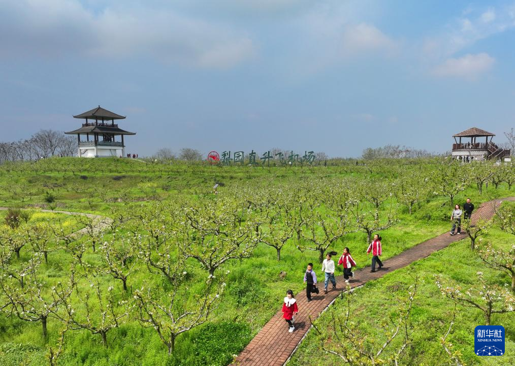 4月1日,小朋友在湖南省衡阳市珠晖区金甲梨园踏青游玩,乐享春假好时光(无人机照片)。新华社发(曹正平摄)