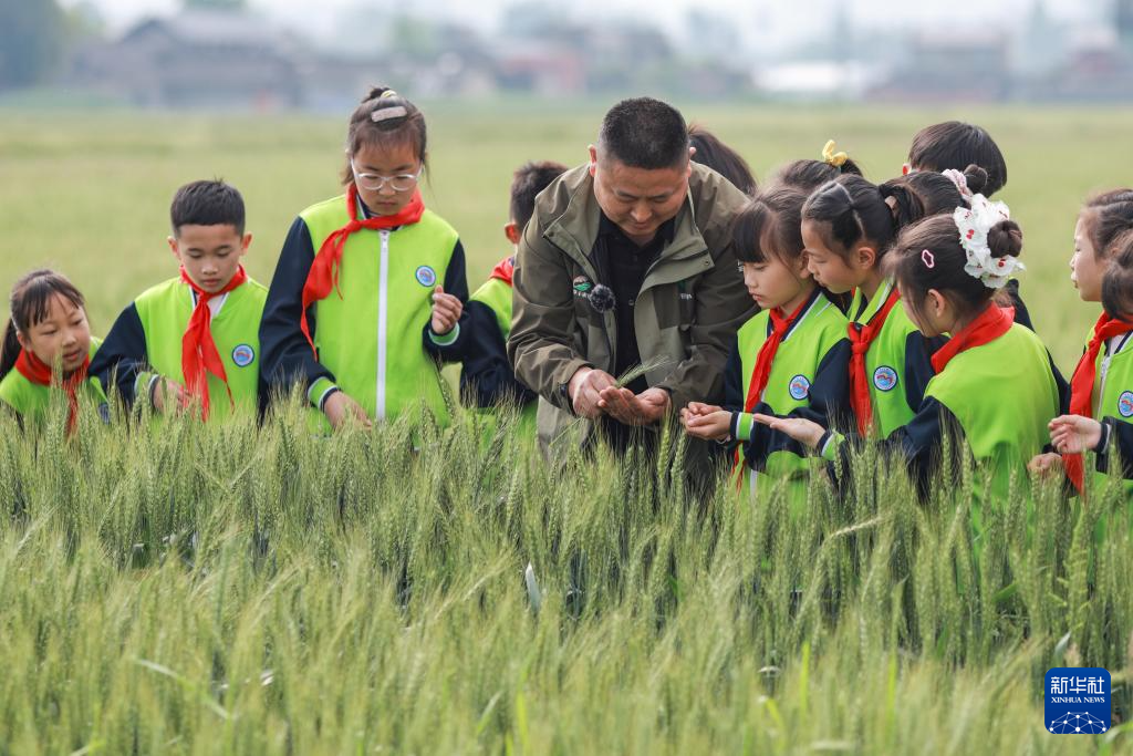 4月1日,在四川省眉山市彭山区观音街道兴崇社区千亩粮油基地,农业技术人员在田间为鹏利小学学生科普小麦播种技术、生长周期及现代农业科技应用等知识。新华社发(翁光建摄)
