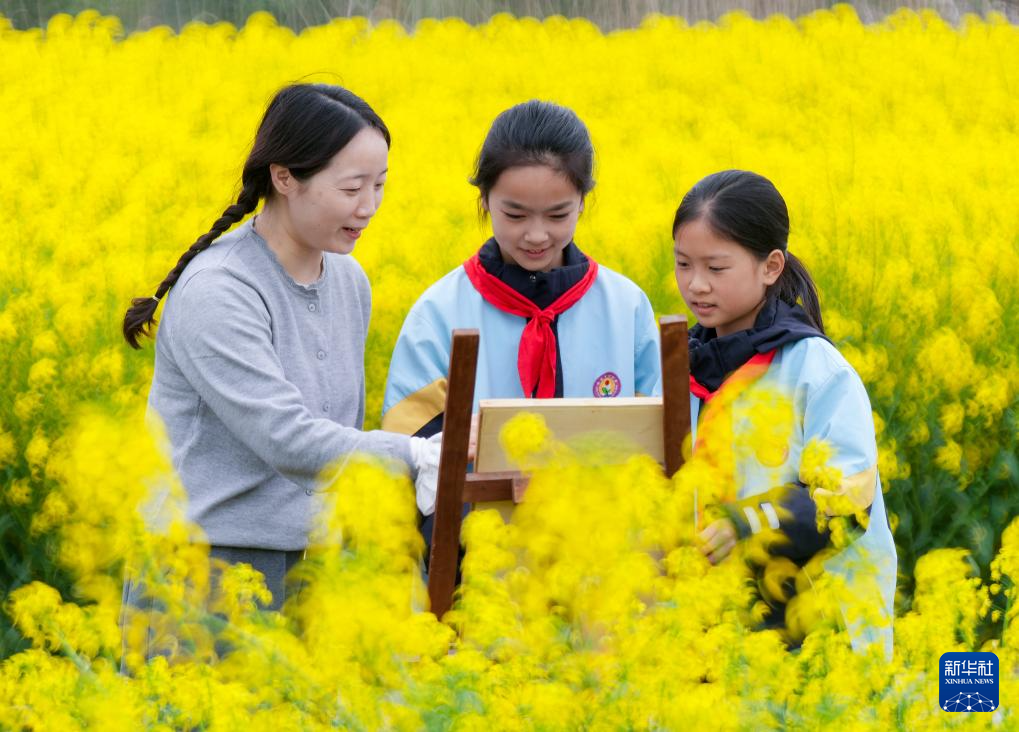 4月1日,江苏省泰州市姜堰区溱潼中心小学的学生在美术老师的指导下进行绘画写生。新华社发(周社根摄)