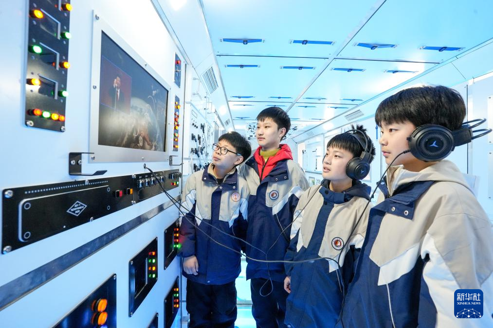 4月1日,在江苏省盐城市射阳县日月岛航天科技科普中心,射阳县海都实验小学的孩子们在模拟太空舱内参观。新华社发(彭岭摄)