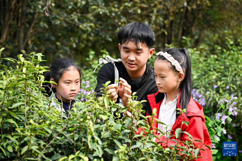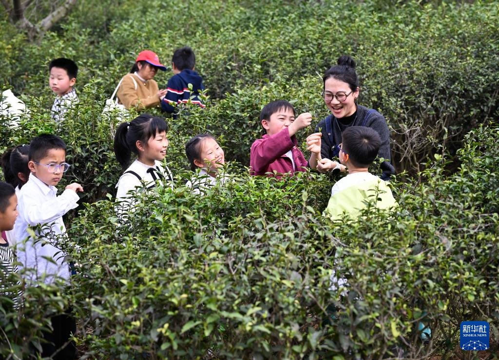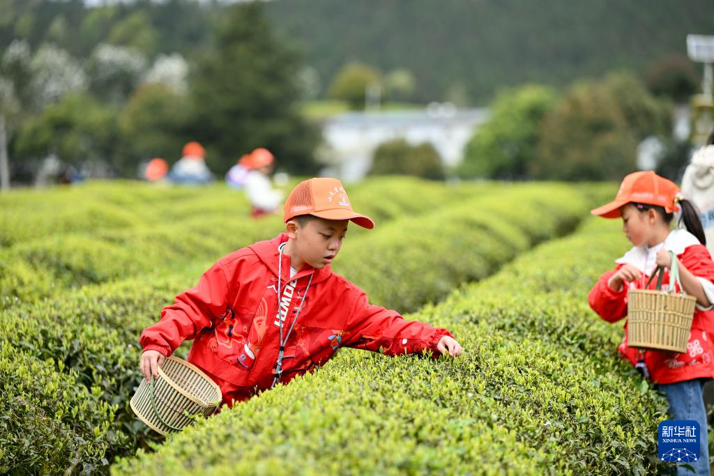 4月1日,小朋友在贵州省贵阳市开阳县龙岗镇坝子村生态茶园体验采摘春茶。新华社发(袁福洪摄)