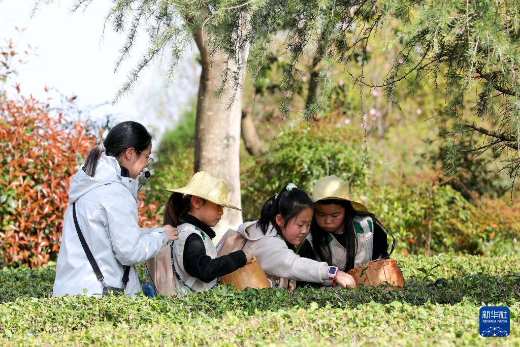 4月1日,学生们利用春假来到安徽省黄山市徽州区谢裕大茶博园体验采摘春茶。新华社发(樊成柱摄)