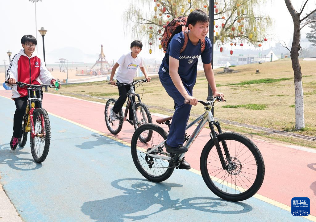 4月1日,在江苏省连云港市在海一方公园,几名初中生结伴在户外骑行。新华社发(王健民摄)