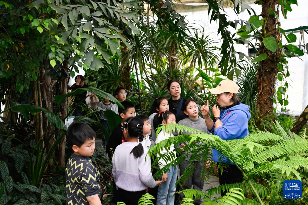 4月1日,在位于江苏省句容市的江苏农博园,工作人员给小朋友讲解植物知识。新华社记者 季春鹏 摄