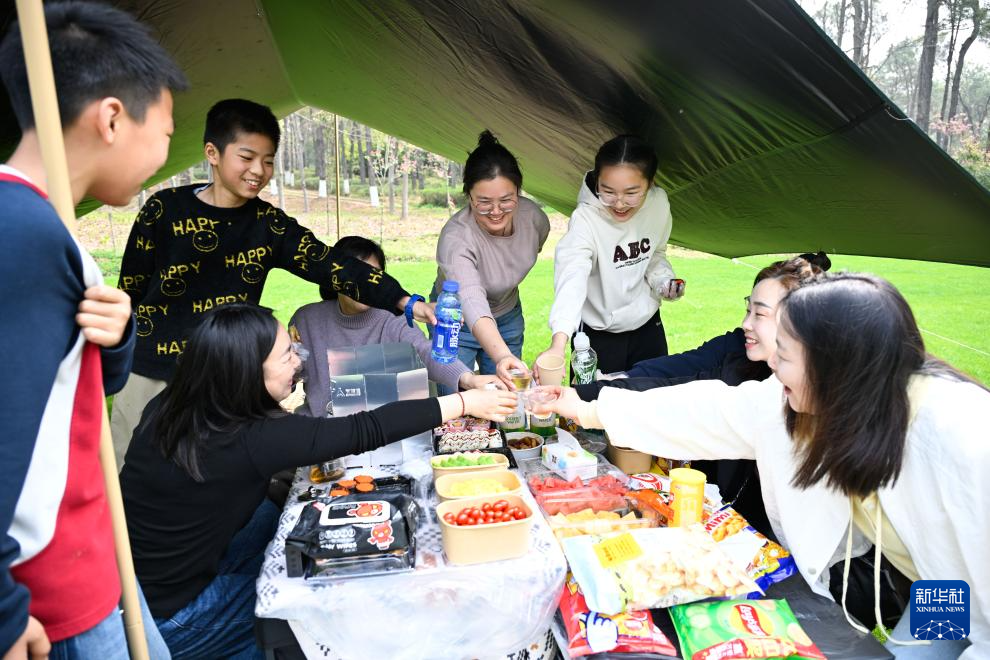 4月1日,小学生和家长在位于江苏省句容市的江苏农博园露营。新华社记者 季春鹏 摄
