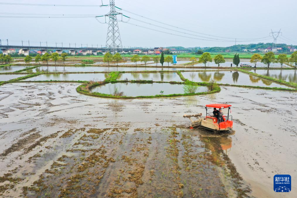 4月8日,在湖南省永州市道县梅花镇车头村,村民驾驶插秧机插早稻(无人机照片)。新华社发(何红福摄)