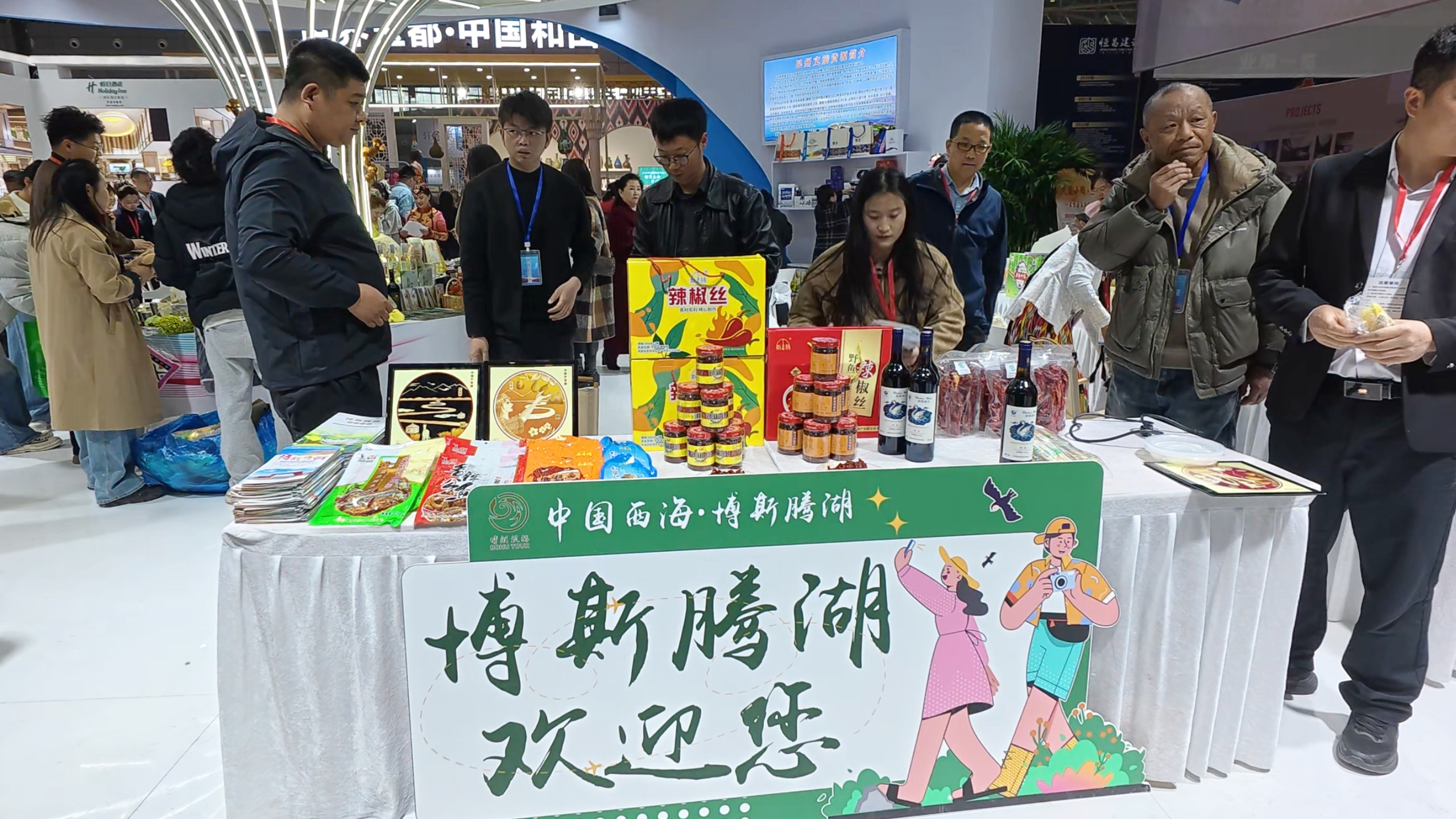 博湖县文旅局工作人员在展台前热情接待咨询游客:“此次参展,我们带来了博斯腾湖辣椒丝、袋装麻辣公鱼、麻辣鲤鱼等特色美食产品。这些产品选用博斯腾湖生态鲜鱼,经秘制配方加工,开袋即食,方便携带,让游客随时随地品尝高原湖鲜的地道风味。”