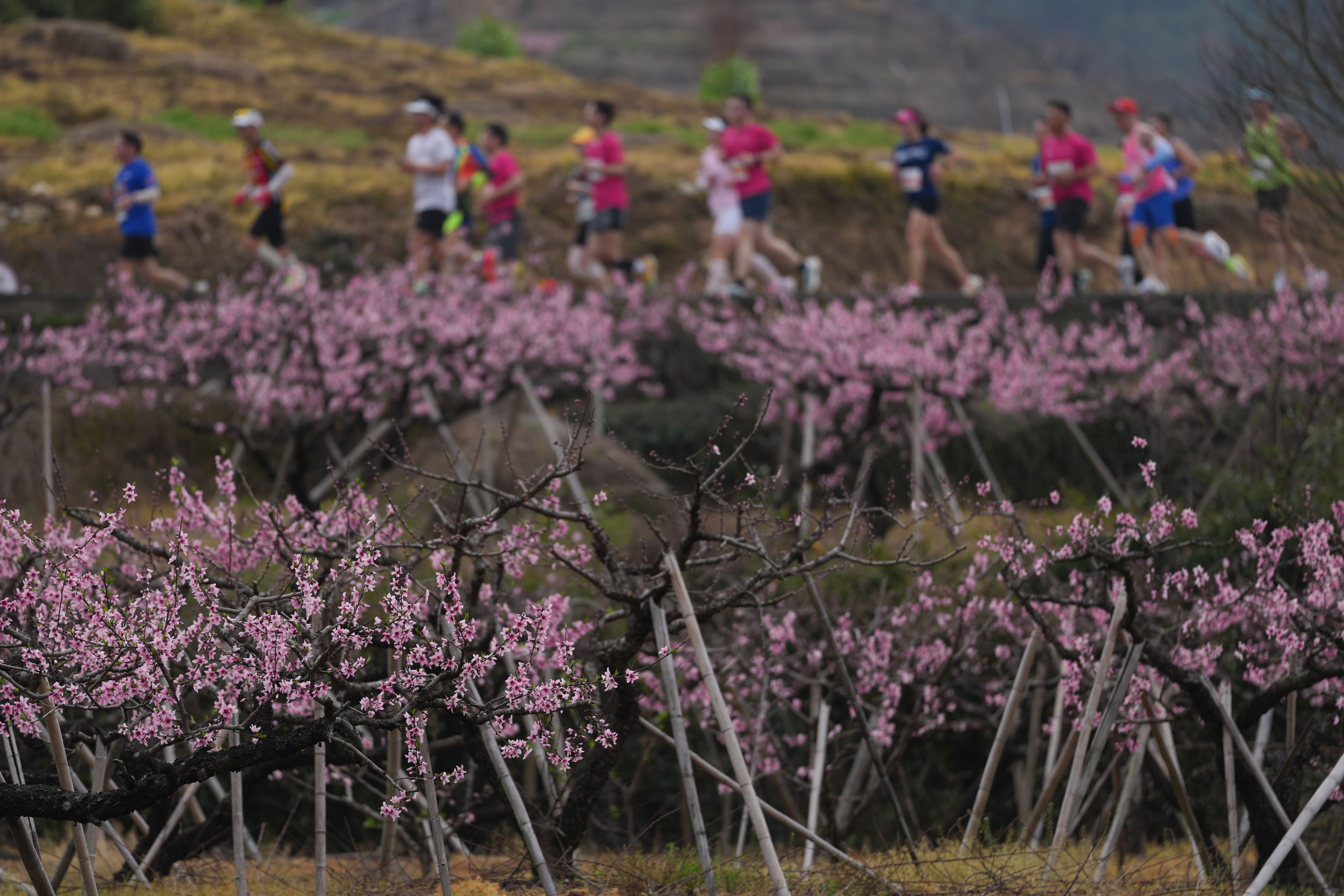 3月22日,2026奉化马拉松在浙江省宁波市奉化区开跑,图为参赛选手经过赛道旁的一片桃园。新华社记者 黄宗治 摄