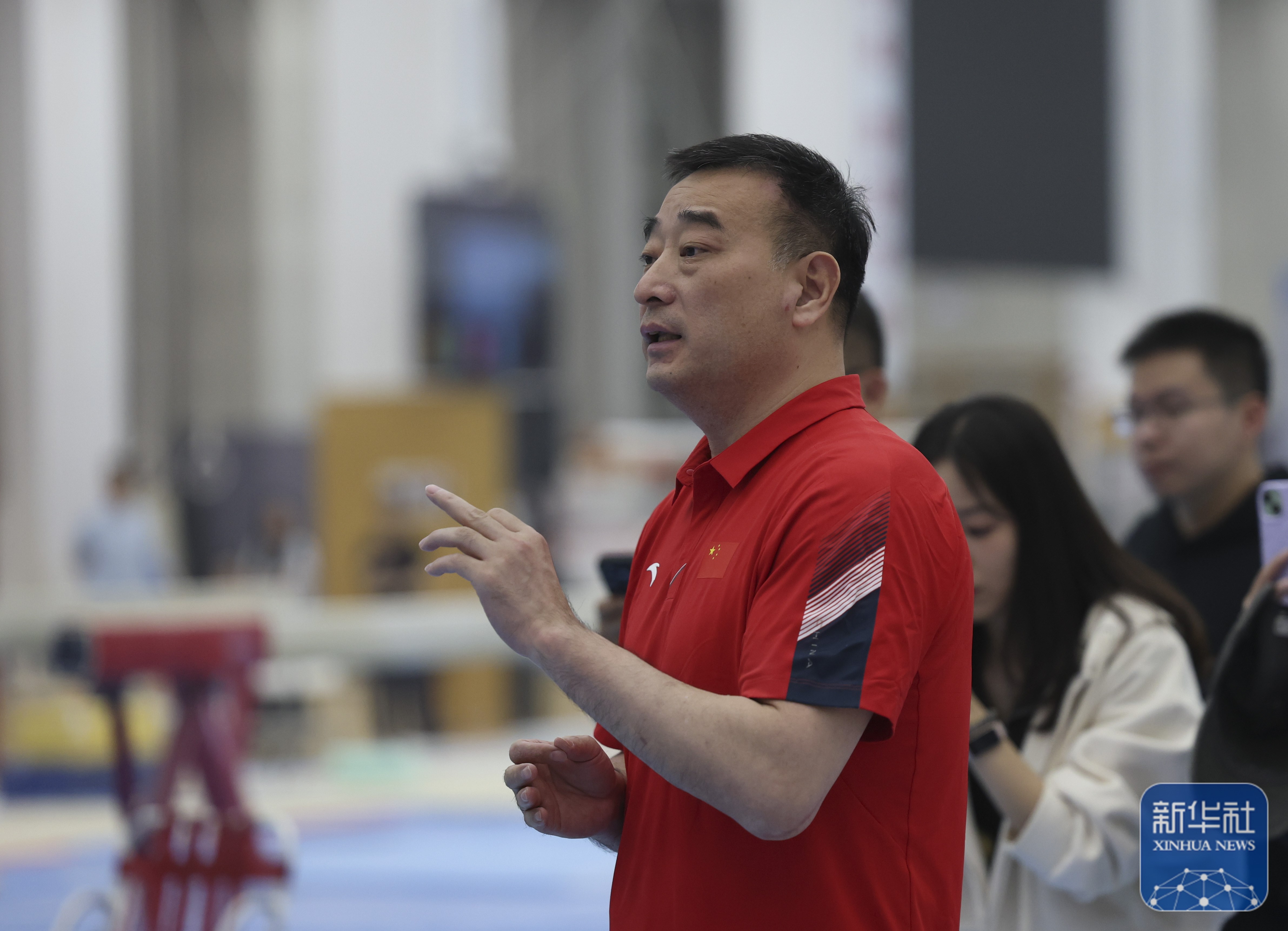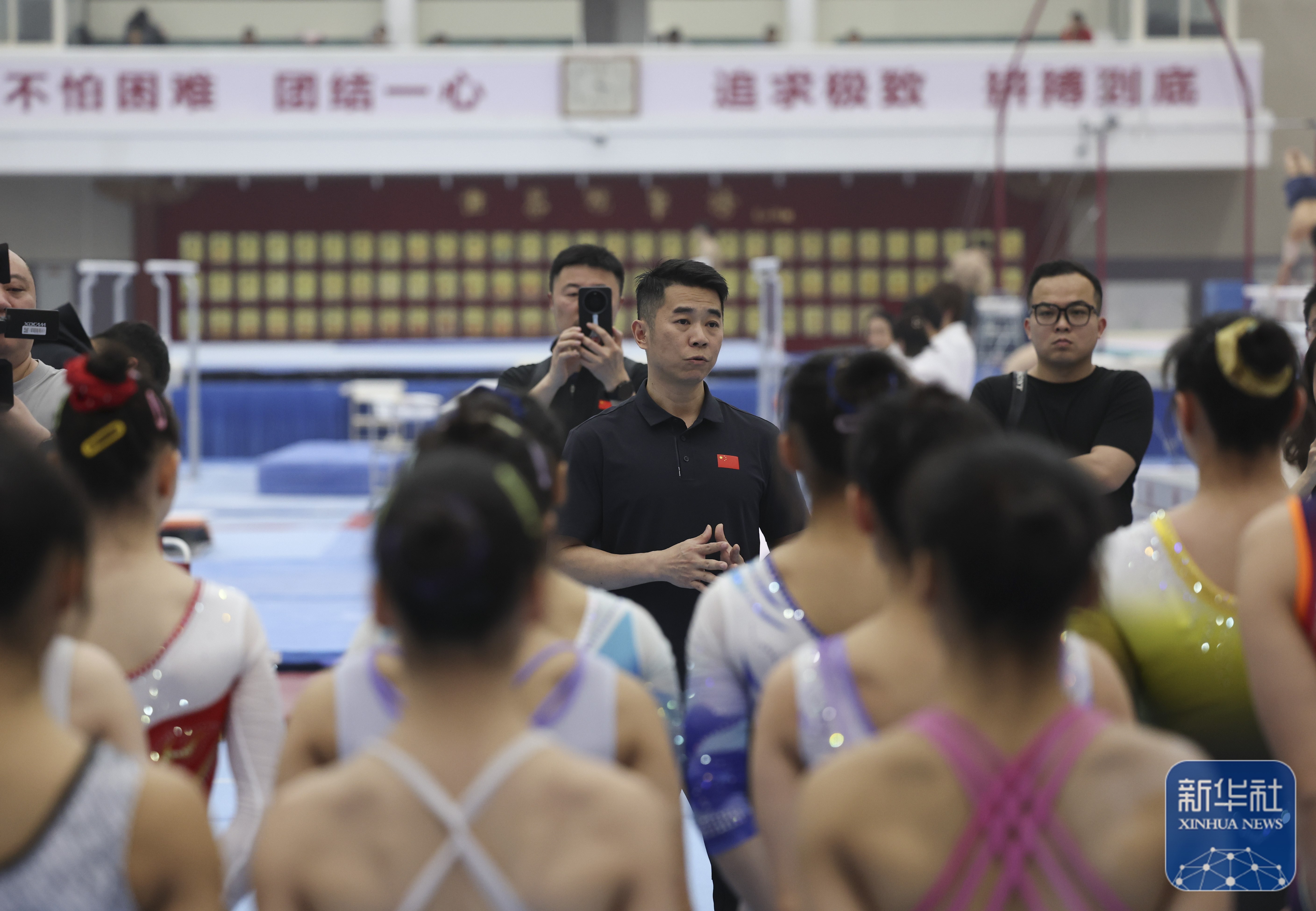 ↑ 中国国家体操队领队陆斌在测试后和队员们交流。
