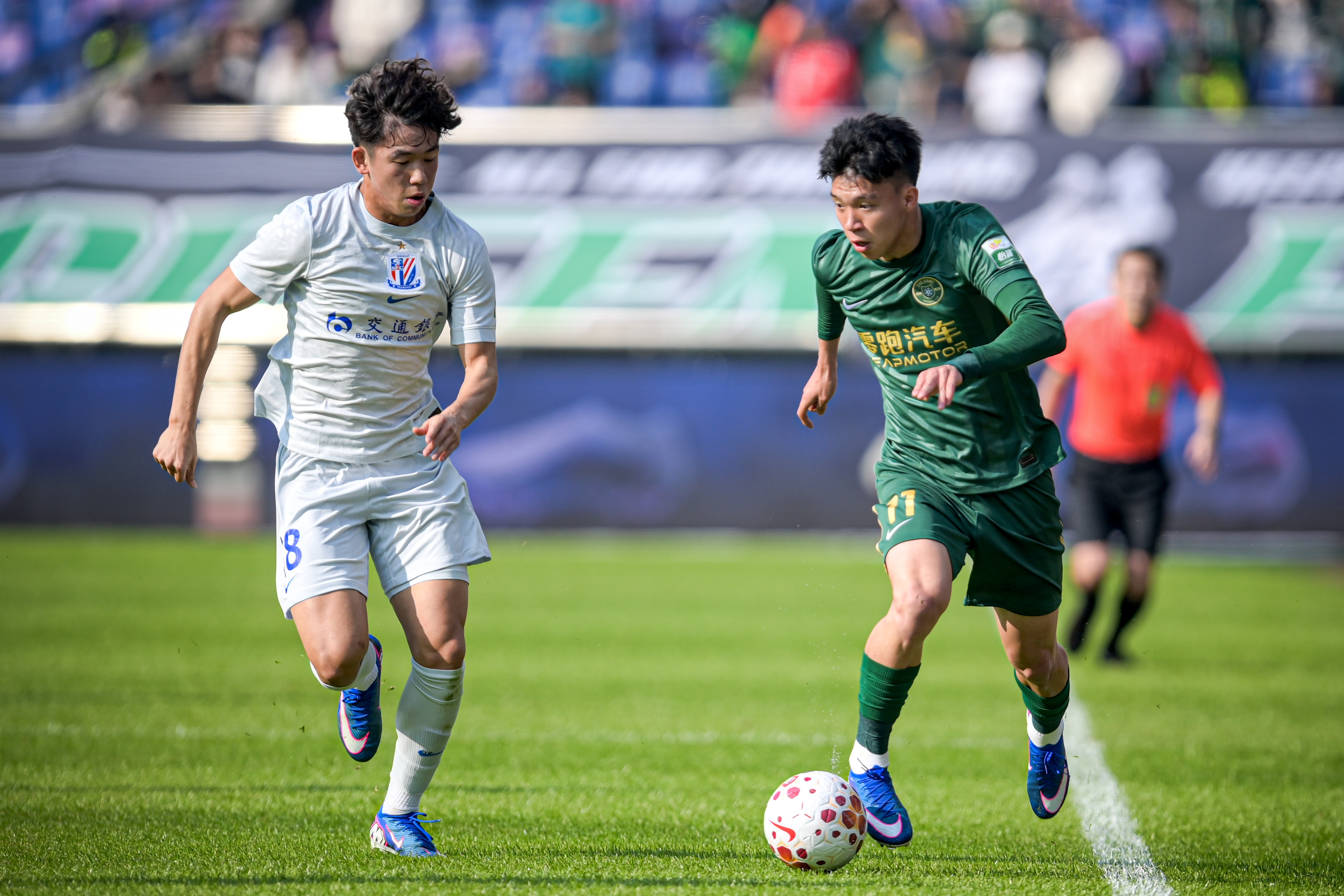 3月14日,浙江队球员王钰栋(右)在比赛中突破。当日,在2026赛季中国足球超级联赛第二轮比赛中,浙江队主场1比1战平上海申花队。新华社记者 江汉 摄