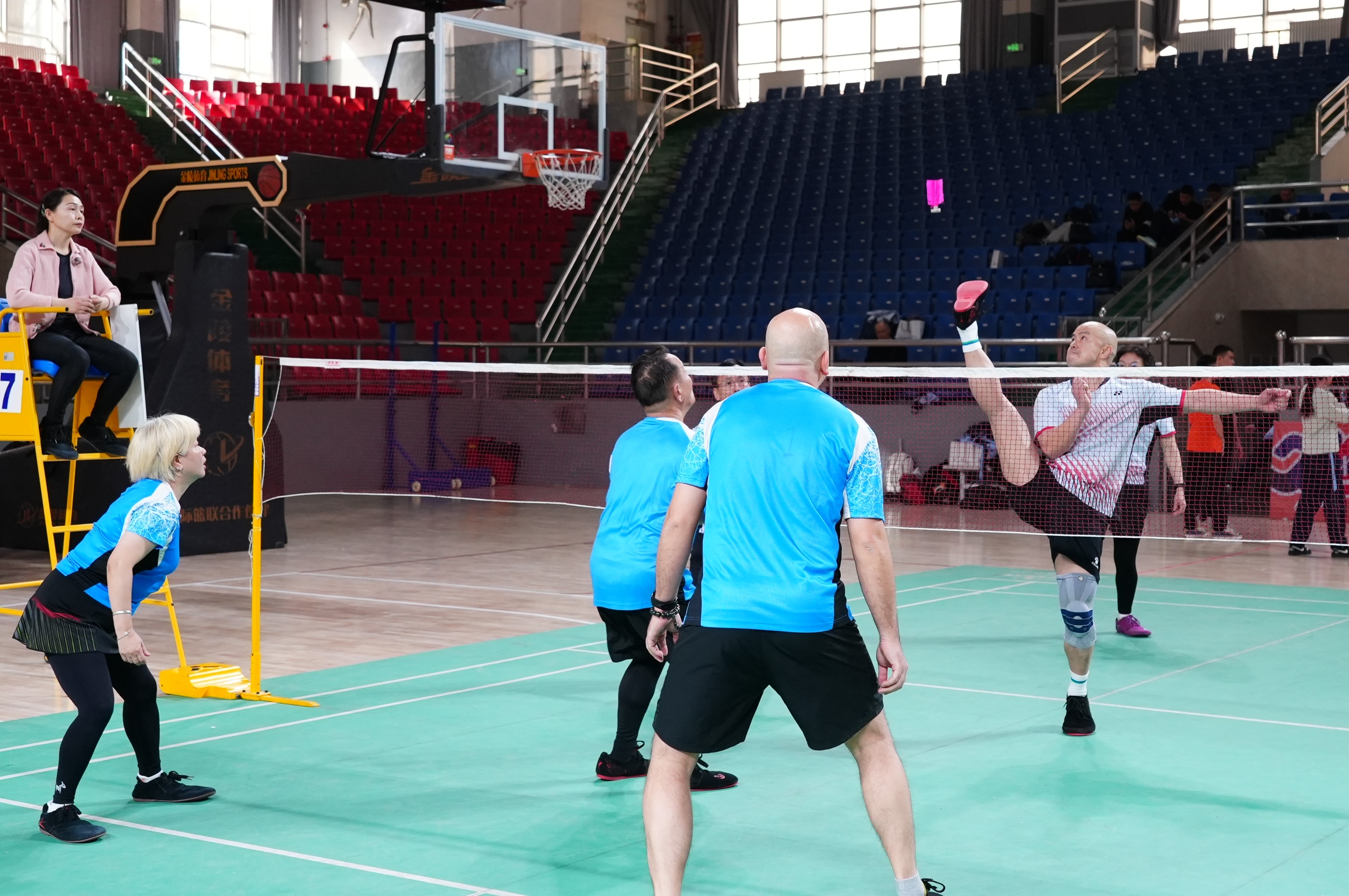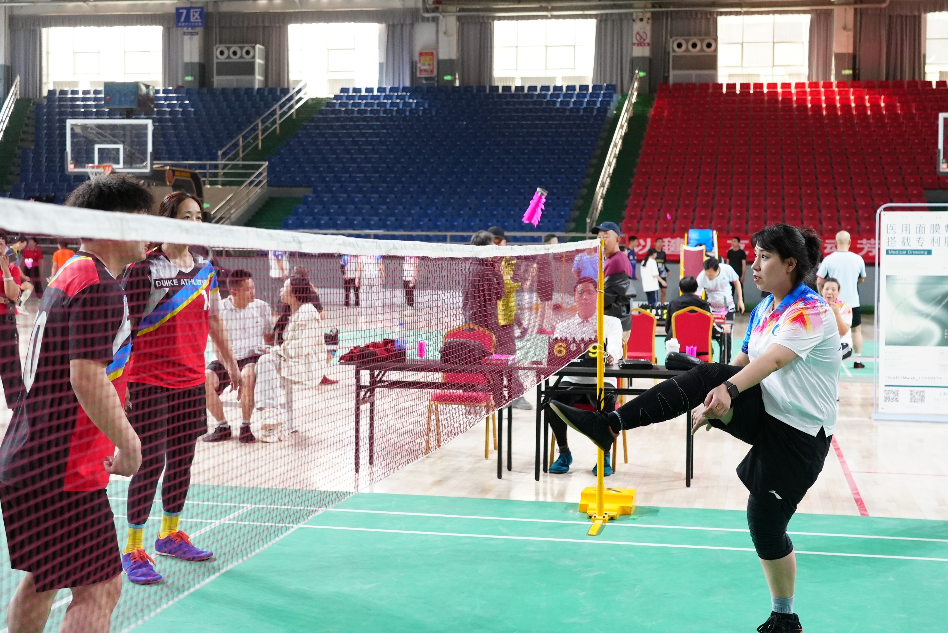 网式毽球赛场战况激烈,选手们隔网对峙,脚尖轻点挑球、脚背弹击送球、膝盖稳托卸力、侧身凌空倒钩,时而后场大力扣杀,时而前场轻巧吊球,小小毽球在空中来回穿梭,对阵双方斗智斗勇、攻防有序,利落招式轮番上演,场面扣人心弦。