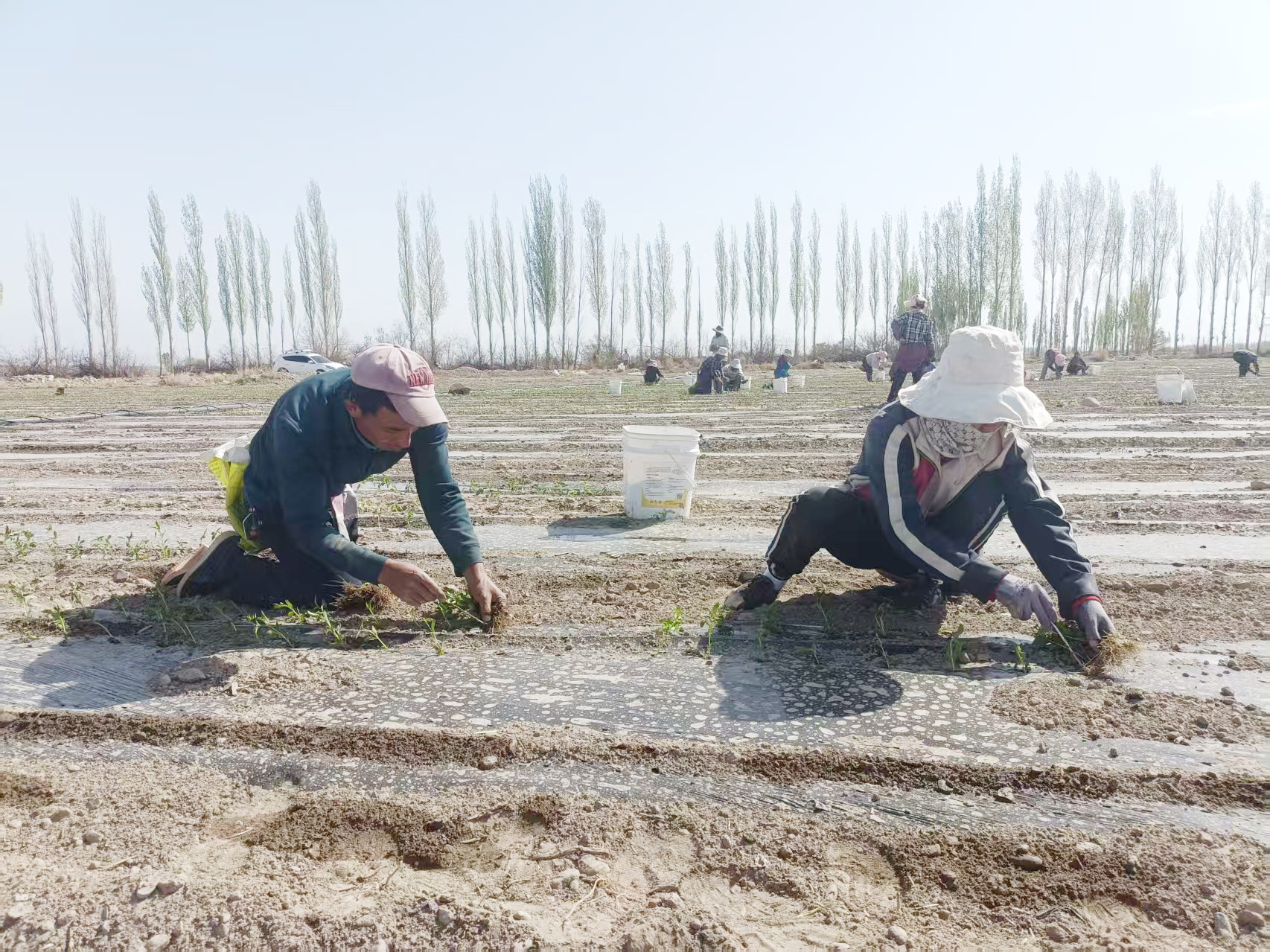 4月12日,在和静县哈尔莫墩镇乌兰尕扎尔村的田间地头,一派热火朝天的甜叶菊栽种景象,村民们分工协作、抢抓农时,挖坑、放苗、覆土、浇水,一株株嫩绿的菊苗扎根沃土,为乡村振兴的“甜蜜事业”再添新绿。