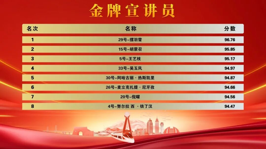 4月1日,由自治区主办的“铸牢中华民族共同体意识 建设社会主义现代化新疆”基层理论宣讲大赛总决赛在乌鲁木齐圆满落幕。经过专家组严格评审,若羌县“红枣红心”理论宣讲团宣讲员胡蒙召,凭借感人至深的作品《阿尔金山的雄鹰——杨松涛同志先进事迹》,从全疆众多优秀选手中脱颖而出,以大赛总决赛个人组第二名的好成绩,荣获自治区“金牌宣讲员”荣誉称号。