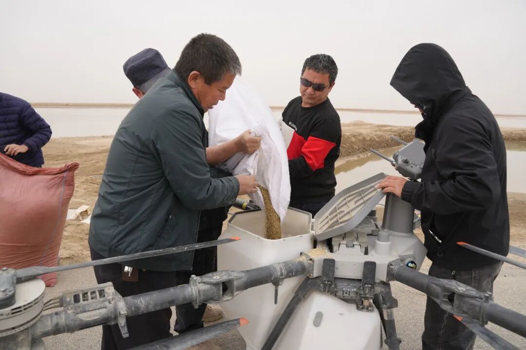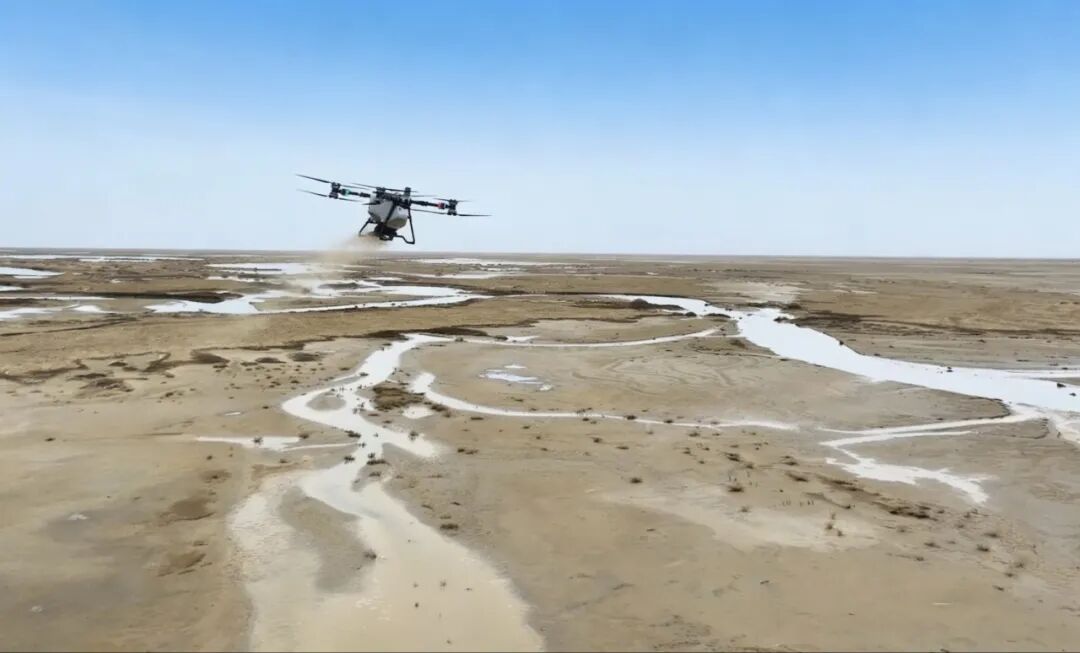 4月1日,在若羌县台特玛湖区域,工作人员将精心筛选的红柳、盐穗木、碱蓬、黑枸杞等适配荒漠生长的本土沙生植物种子,装填至植保无人机机舱。专业飞手依据“分级漫溢”的灌溉覆盖范围,精准划定飞播作业区域,短短一小时便能完成上百亩沙地的播种任务,让种子稳稳落进经水流浸润滋养的松软沙壤之中。